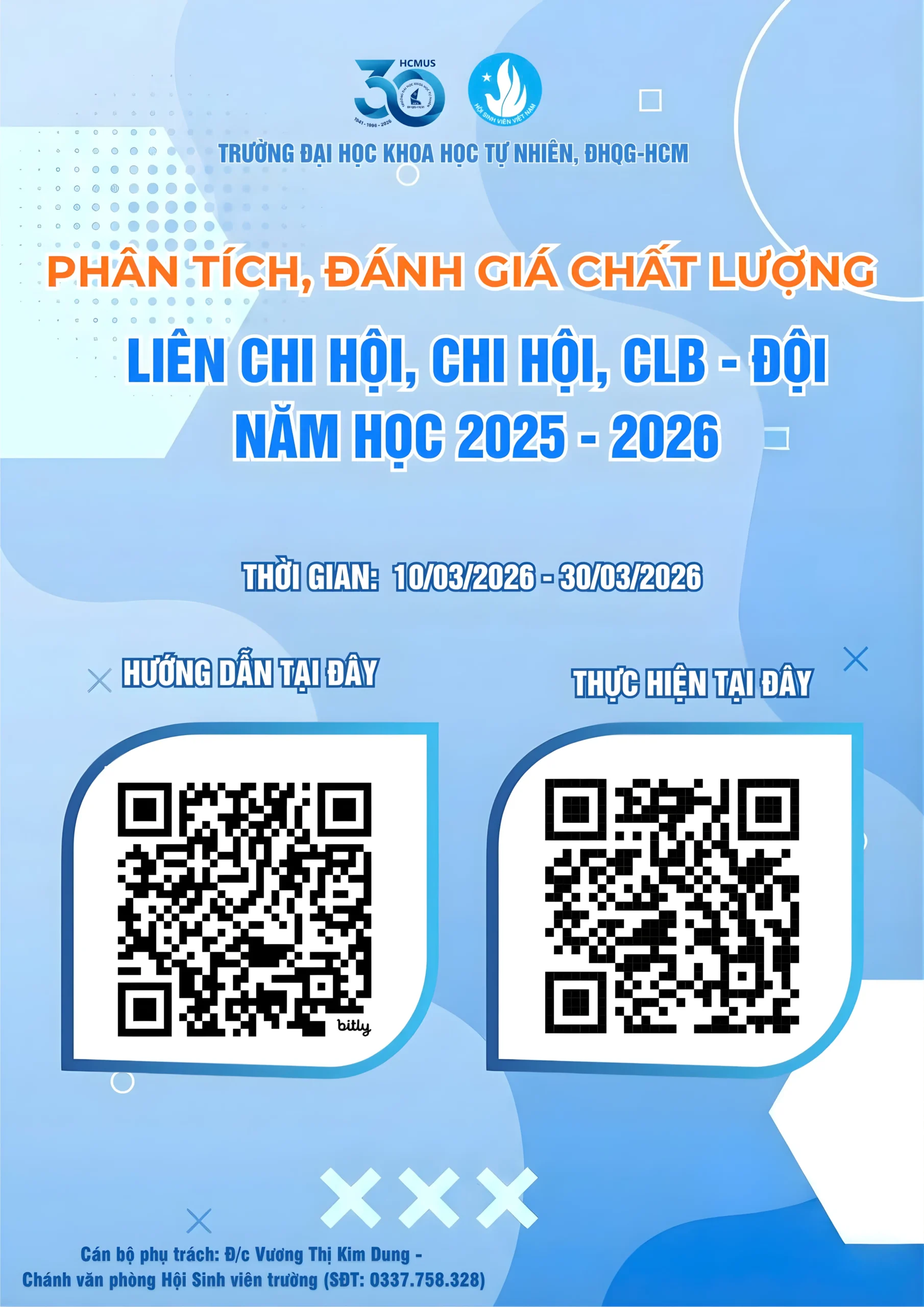 Nhằm nâng cao chất lượng hoạt động Hội và phát huy hiệu quả phong trào sinh viên, Hội Sinh viên Trường Đại học Khoa học tự nhiên, ĐHQG-HCM triển khai công tác phân tích, đánh giá chất lượng Liên Chi hội, Chi hội, CLB – Đội năm học 2025 – 2026.