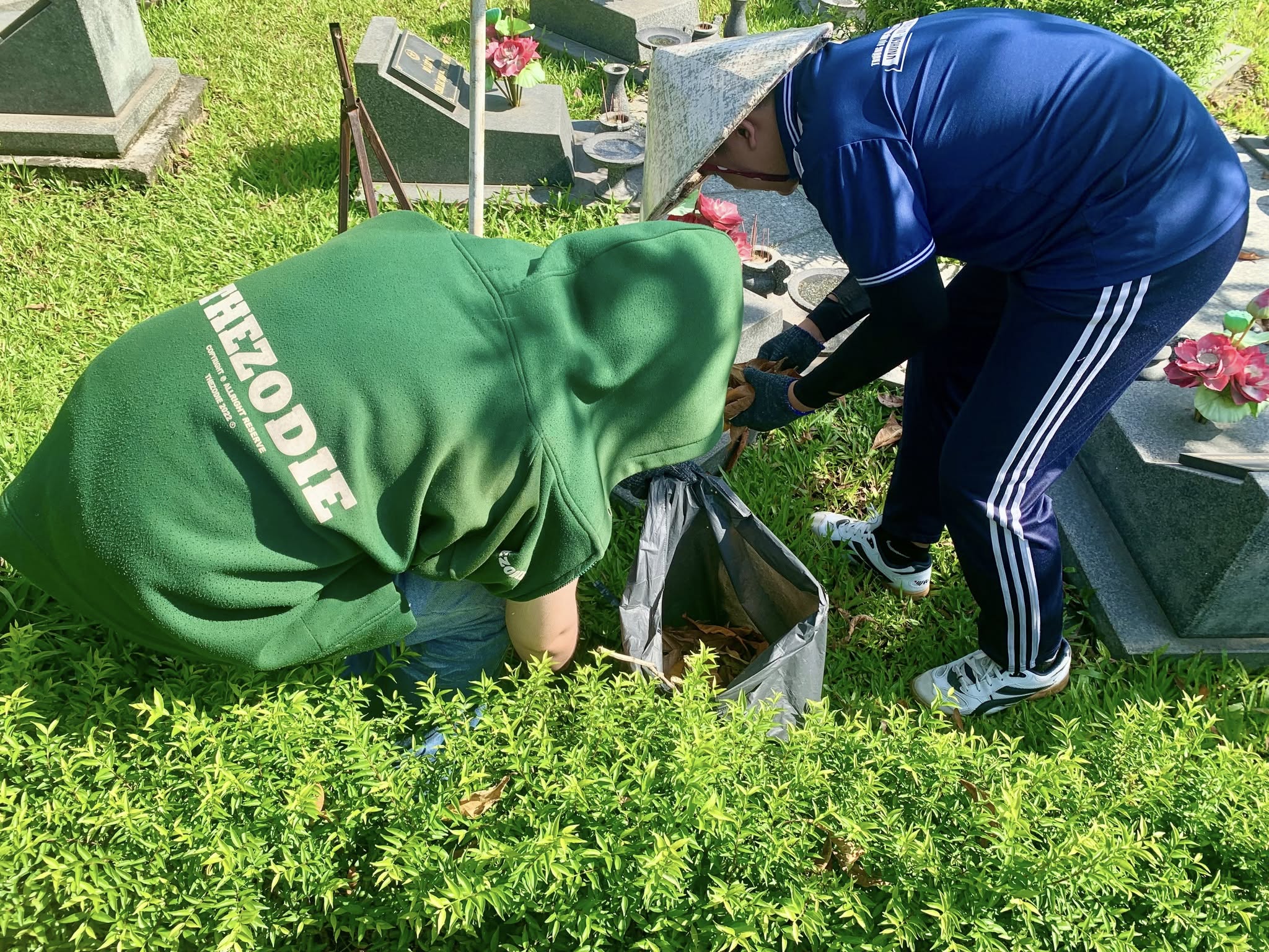 Ngay sau lễ dâng hương, các bạn đoàn viên đã chia thành nhiều nhóm để thực hiện công tác vệ sinh khuôn viên nghĩa trang: nhổ cỏ, nhặt lá khô, dọn sạch các lối đi và chăm sóc khu vực xung quanh các phần mộ. Những hình ảnh đoàn viên kiên trì làm sạch từng khoảng cỏ, thu gom rác, chỉnh trang cảnh quan đã góp phần giữ gìn không gian nghĩa trang trang nghiêm, xanh sạch và thành kính.