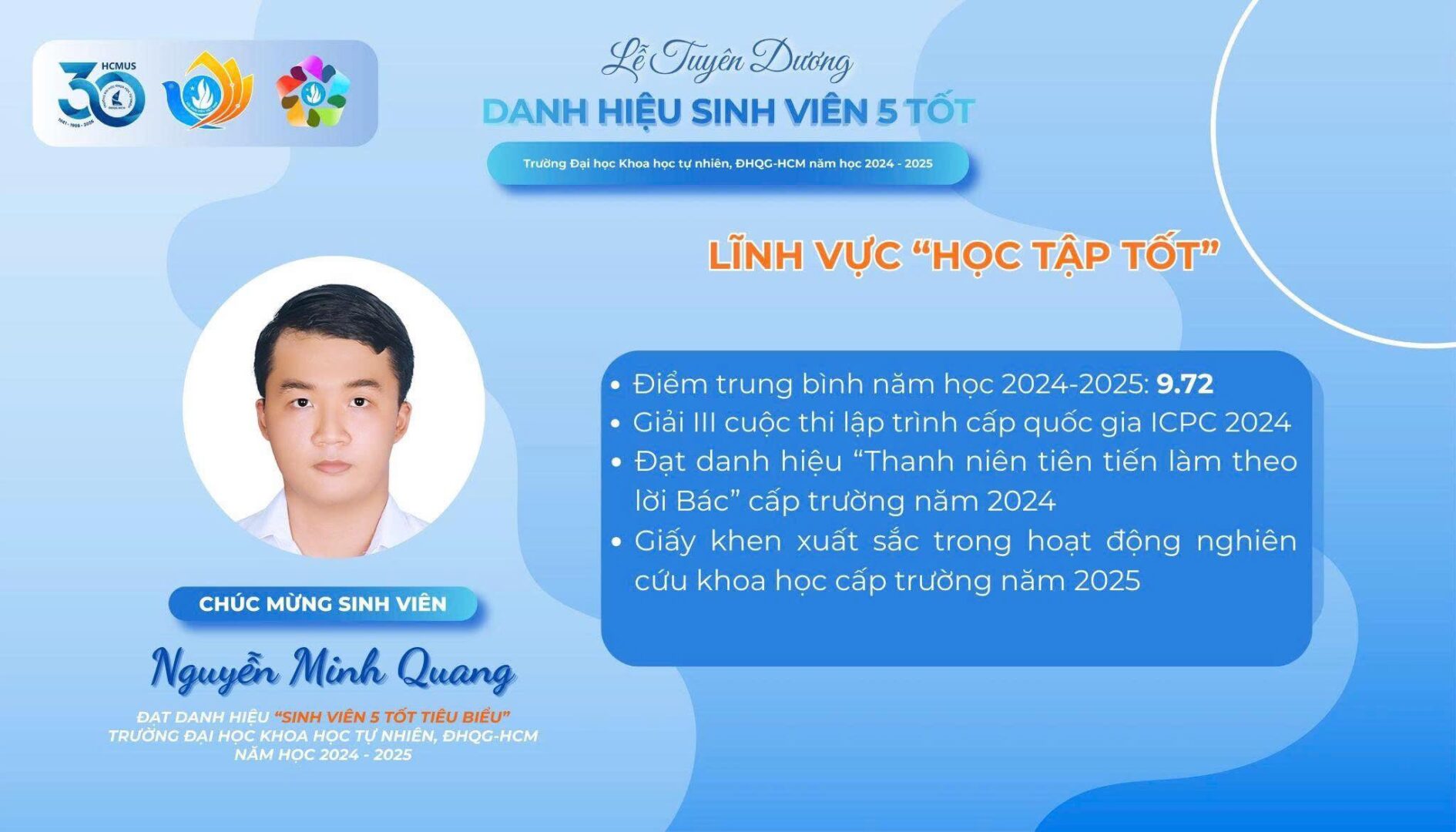 Tổng hòa tất cả những nỗ lực đó, Nguyễn Minh Quang xứng đáng được vinh danh là Sinh viên 5 Tốt tiêu biểu lĩnh vực Học tập tốt của Trường Đại học Khoa học tự nhiên, ĐHQG-HCM năm học 2024–2025. Danh hiệu này như một lời khẳng định trọn vẹn cho một hành trình mà ở đó, mỗi thành tích không phải là đích đến, mà là bước đệm cho những hoài bão lớn hơn phía trước.